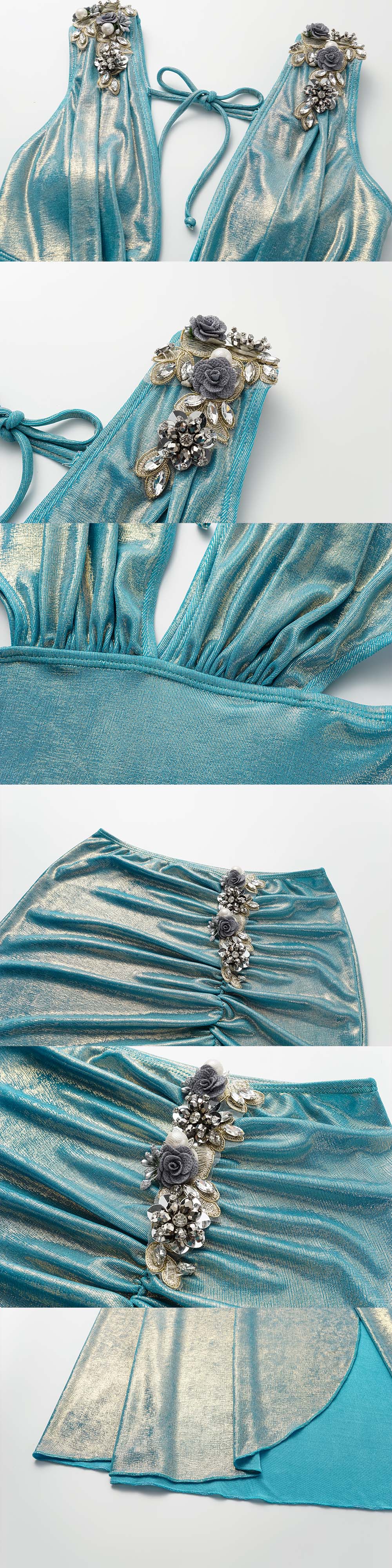 Blue Shiny Beaded Flowers Deep V-neck One Piece Swimsuit and Split Skirt