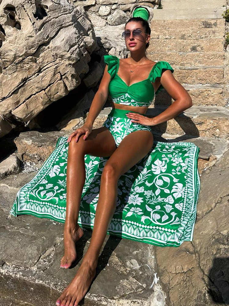 Ruffle Green Bikini Swimsuit and Sarong Flaxmaker