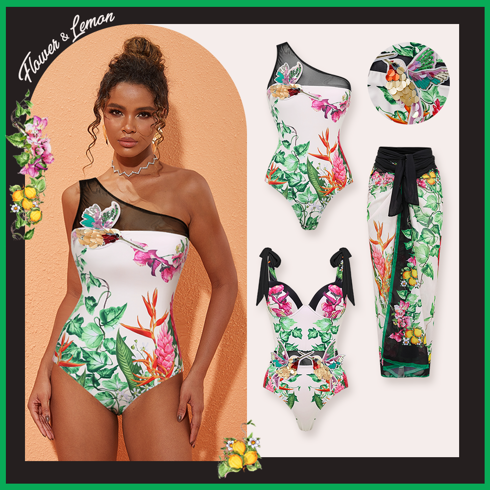 Sequin Embroidered Bird One Shoulder Printed One Piece Swimsuit and Sarong or Skirt Flaxmaker