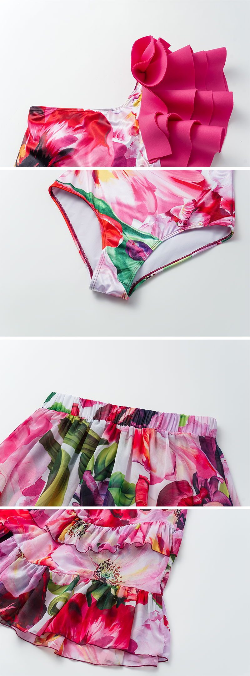 Ruffle One Shoulder Flower Printed One Piece Swimsuit and Skirt Flaxmaker