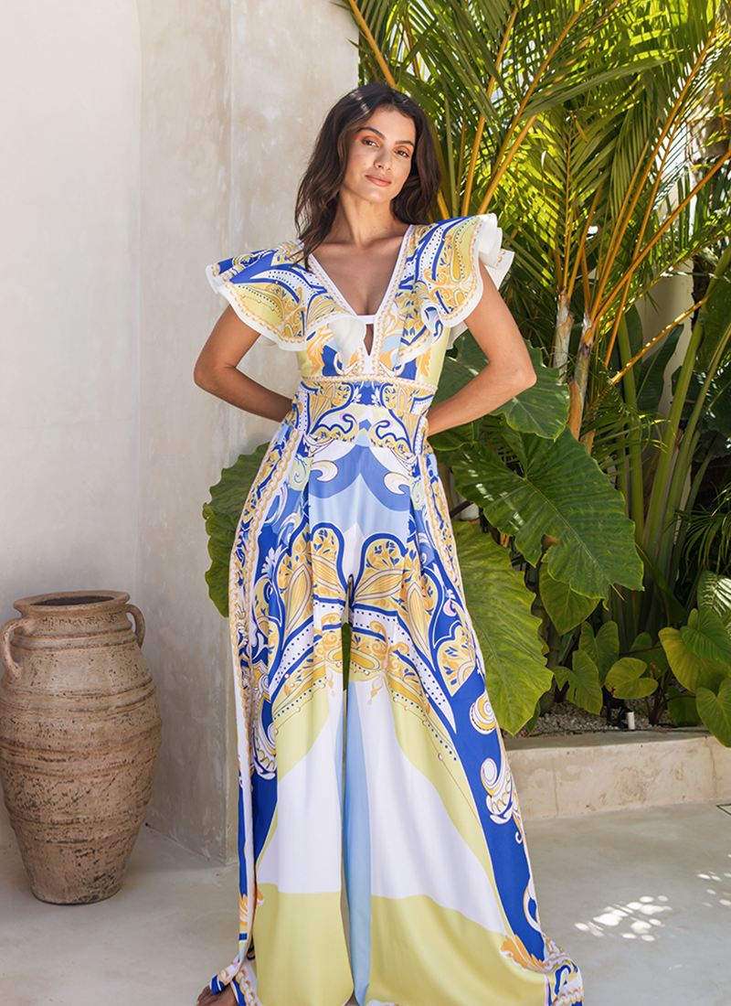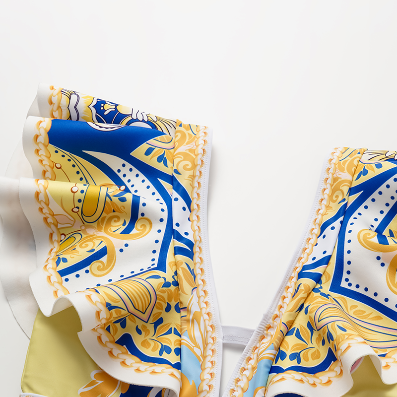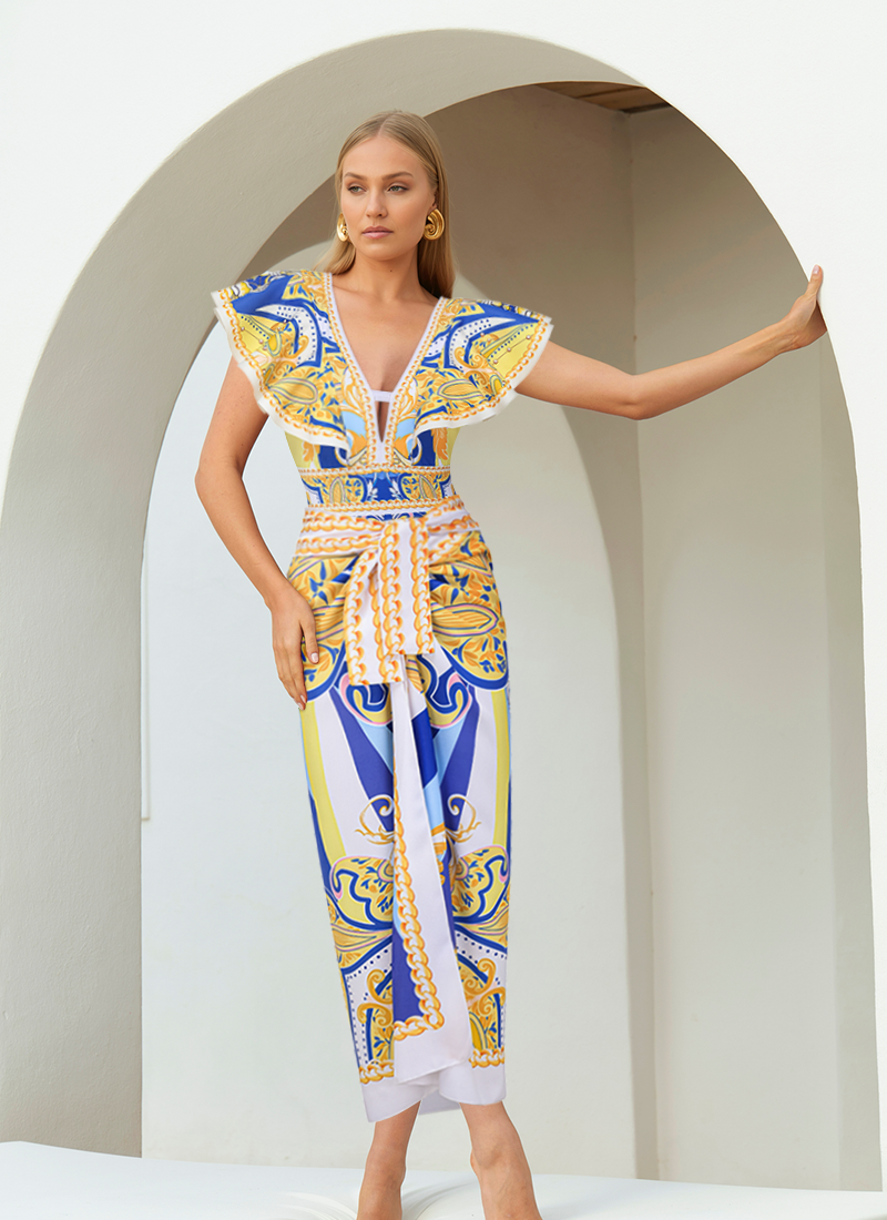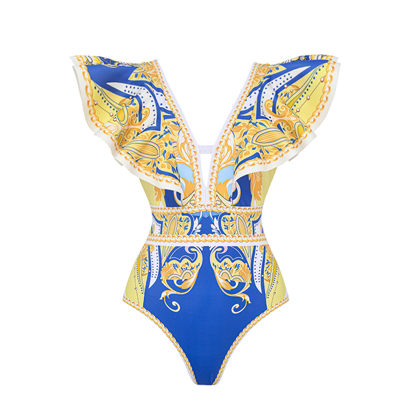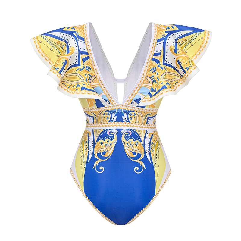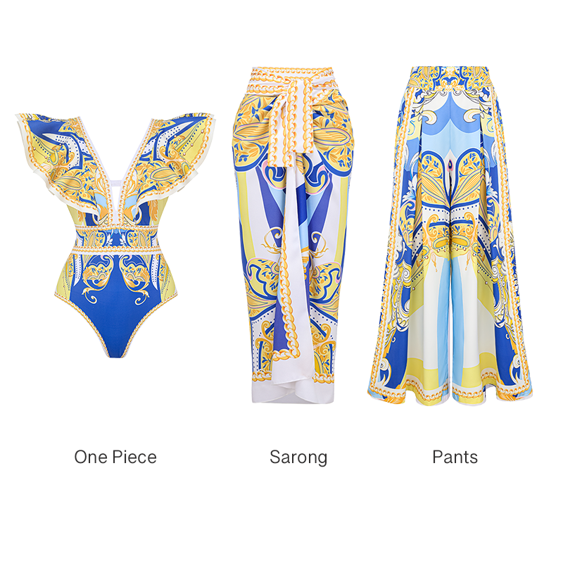 Ruffle V Neck Pattern Print One Piece Swimsuit and Sarong or Pants