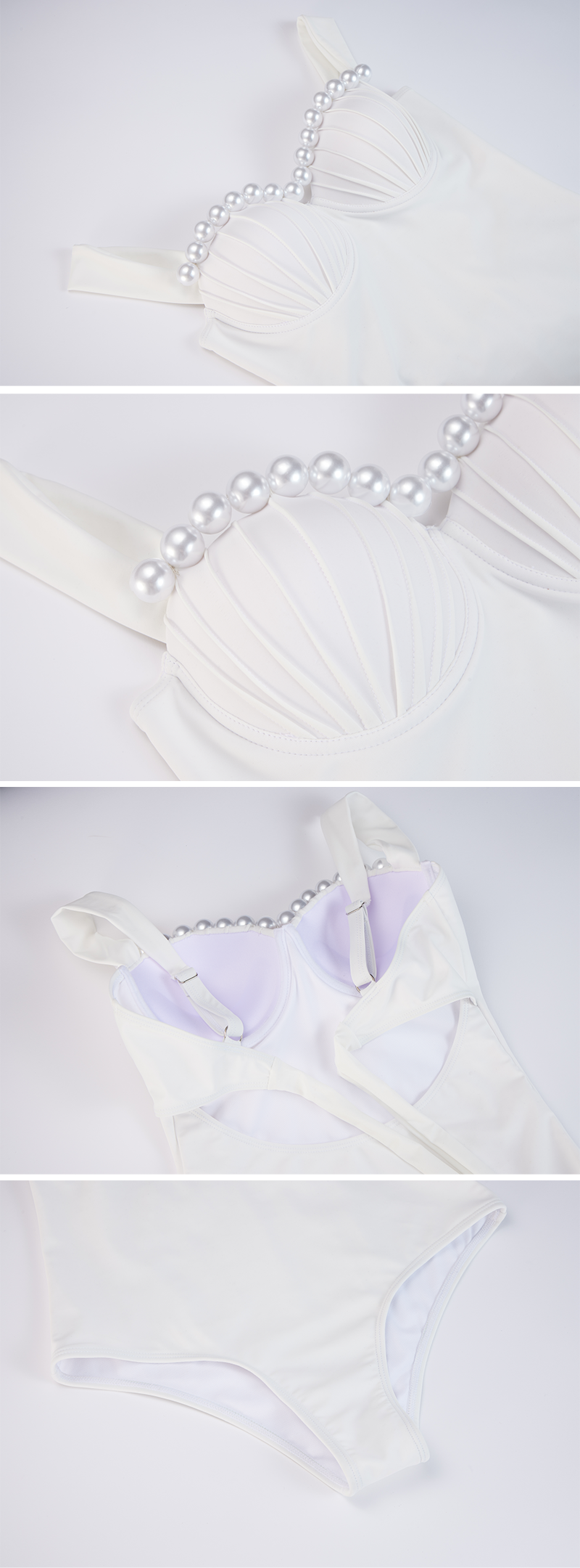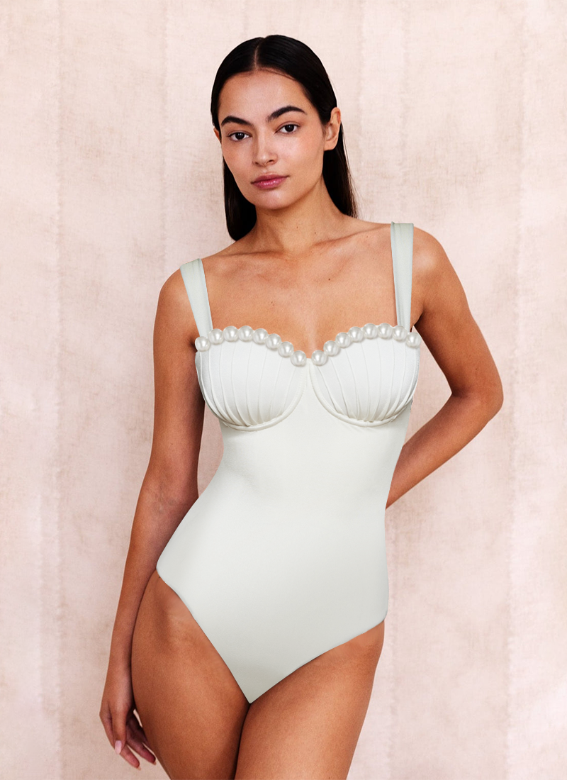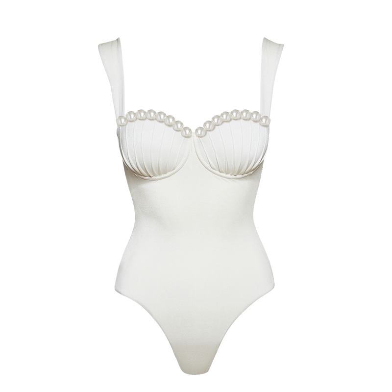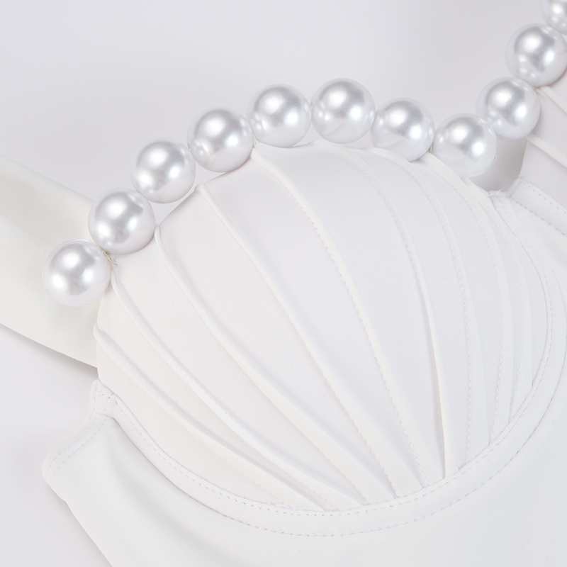 Sling Artificial Pearl Decor White One Piece Swimsuit and Skirt