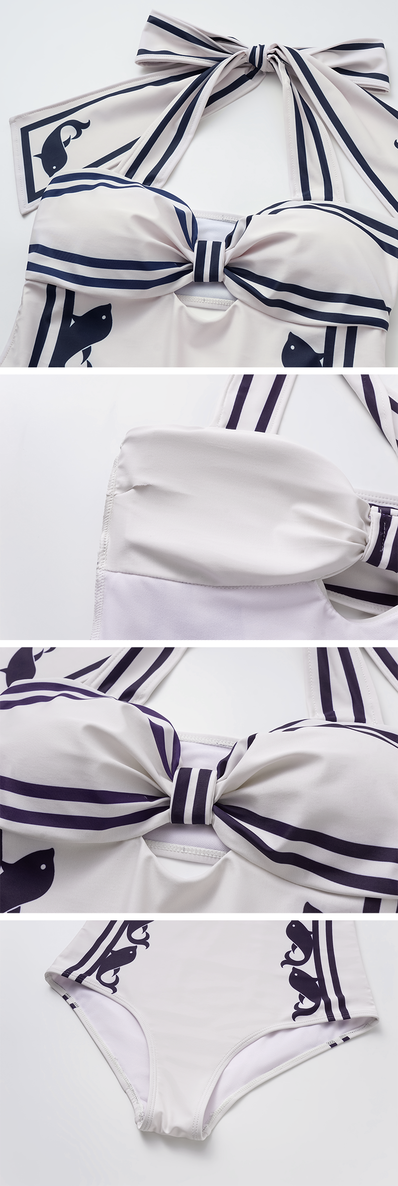Navy Style Printed Bow Tie Decor One Piece Swimsuit and Skirt
