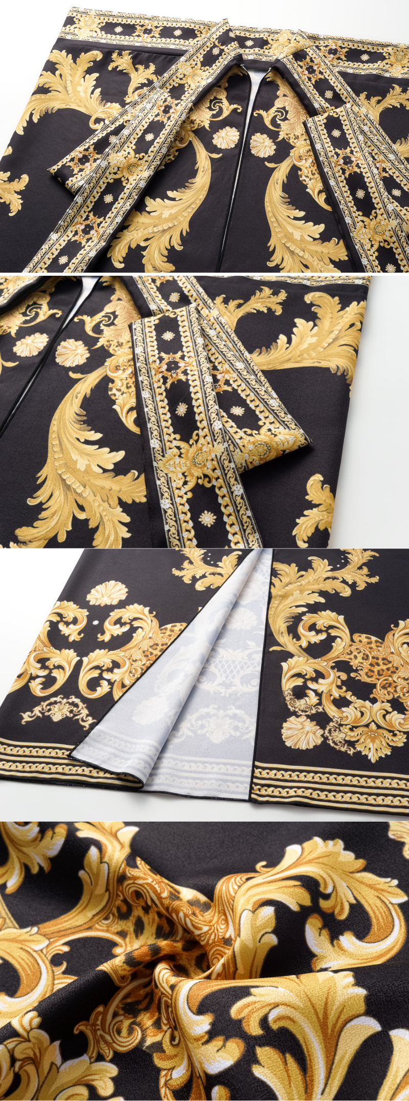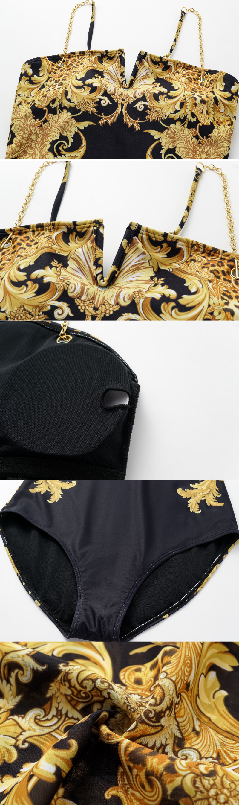Vintage Black Gold Baroque Print Metal chain small V-neck One Piece Swimsuit and Skirt